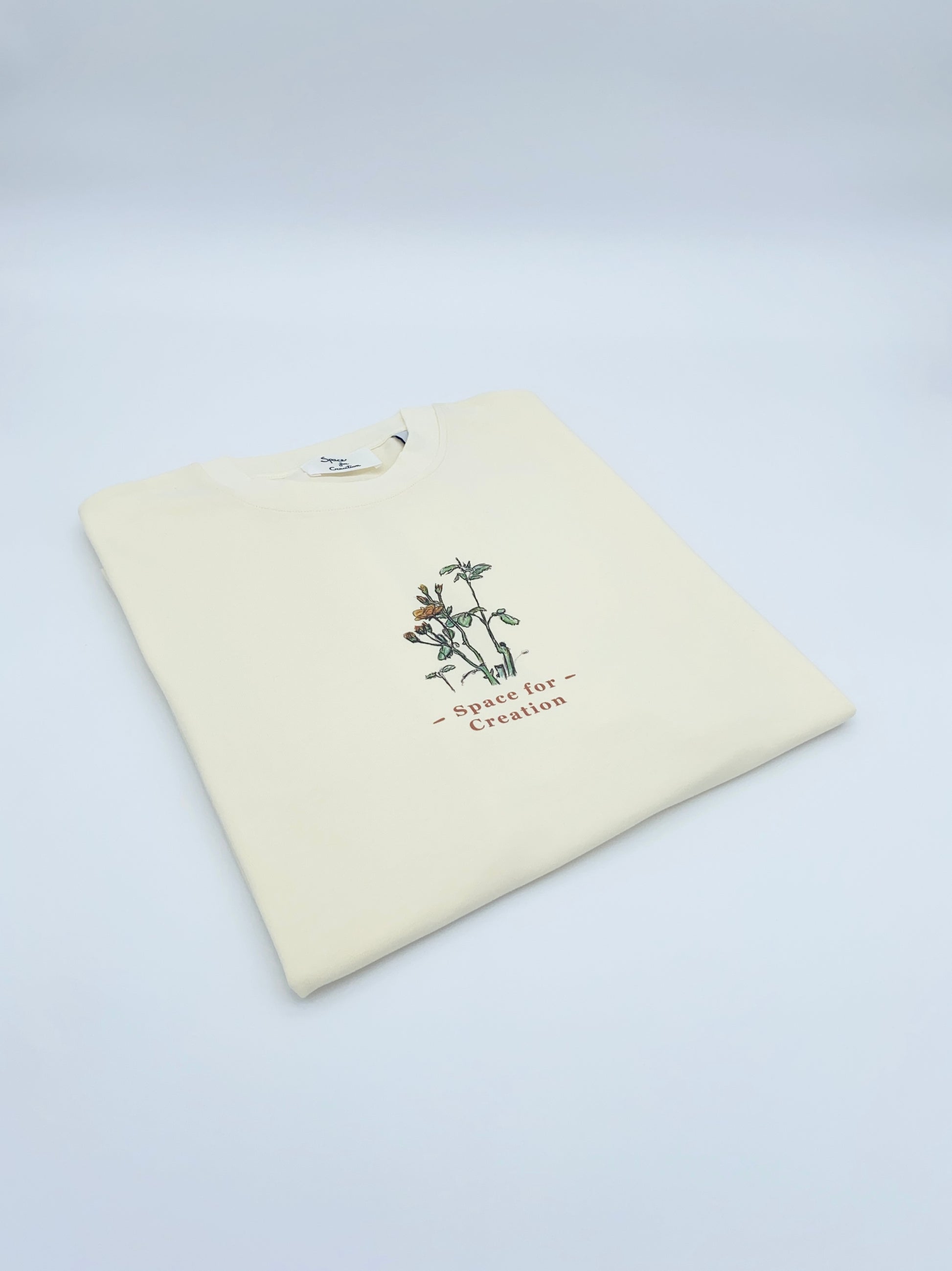 The Rose Tee captures the soft glow of autumn through the image of a single yellow rose. Drawn in a nostalgic botanical style, the flower feels both delicate and full of quiet strength. Set against a cream base, the warm tones echo the season’s changing light, like looking through a window at nature just before it fades. With its mix of drawing techniques, the design feels layered yet subtle — a timeless piece that carries the calm of autumn days.
